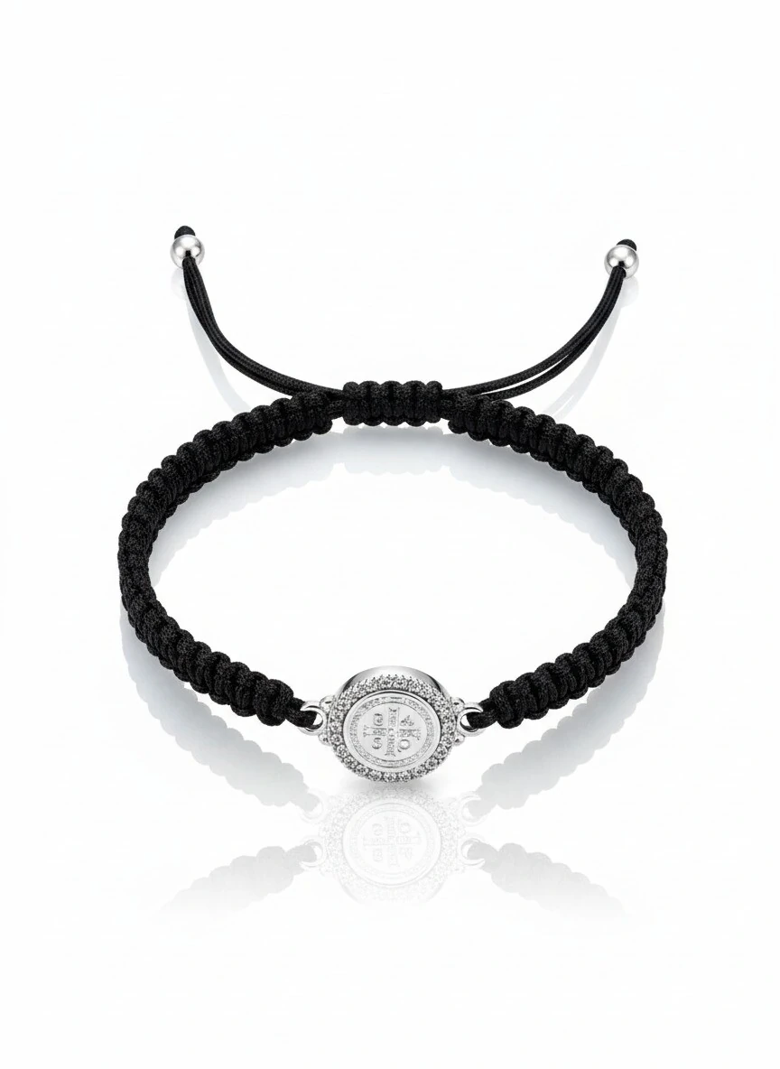 Design: Pulseira em macramê preto com medalha central de São Bento, símbolo de fé e proteção, em um estilo moderno e versátil.