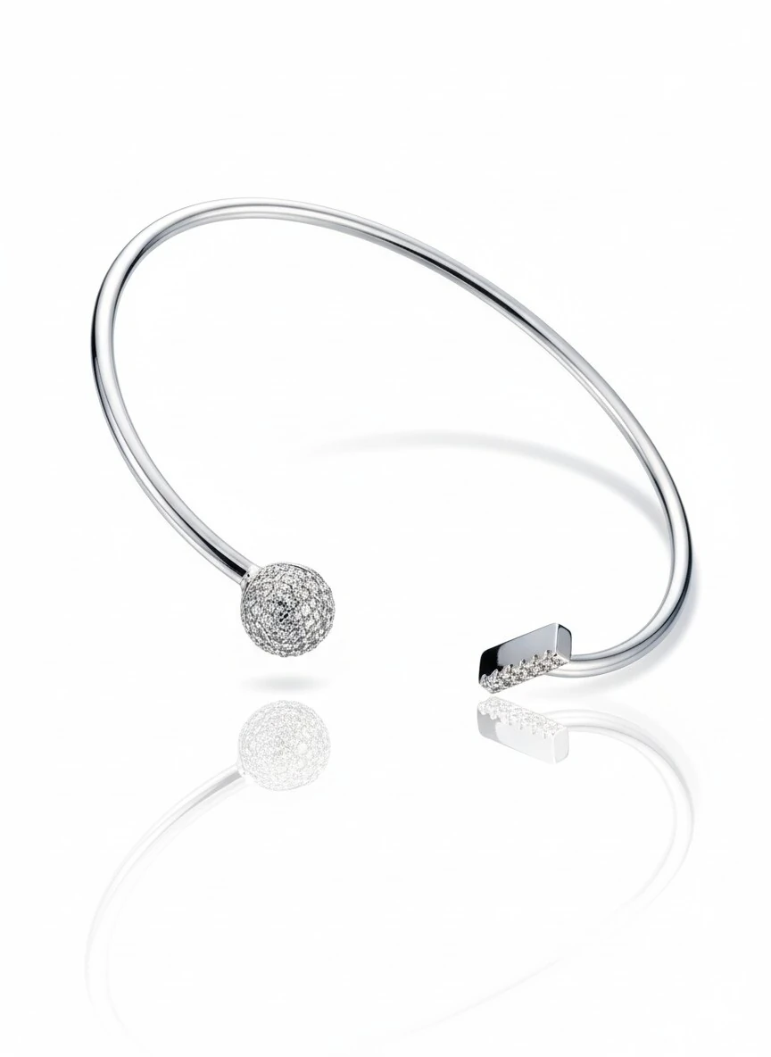 Design: Pulseira estilo bracelete aberto, com extremidades assimétricas — uma em meia bola cravejada de zircônias e outra em palito liso com detalhes brilhantes, resultando em um visual moderno e elegante.