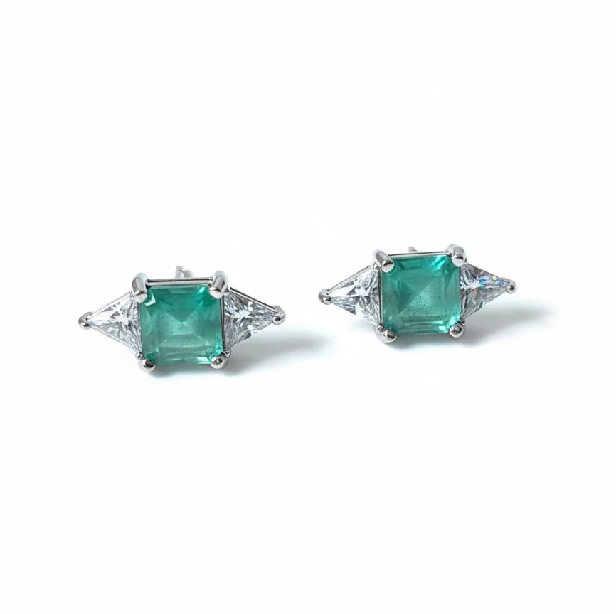Design: Brinco com composição geométrica elegante, unindo pedra central quadrada e laterais triangulares, criando um visual sofisticado e contemporâneo.