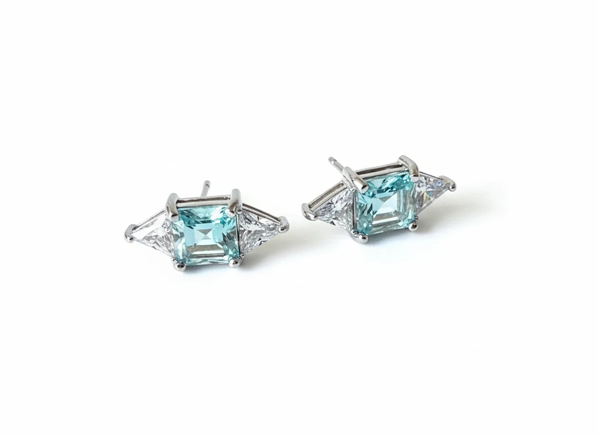 Design: Brinco com pedra central quadrada e laterais triangulares, combinando formas geométricas em um visual moderno e elegante.