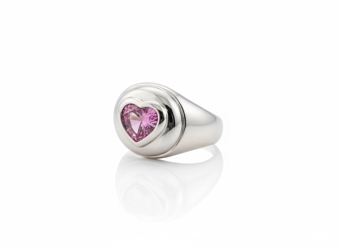 Design: Anel estilo dedinho com formato de coração central, unindo romantismo e sofisticação em uma peça moderna e elegante.