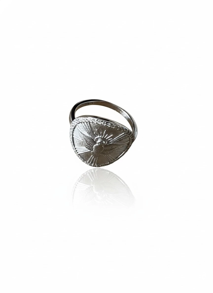 Design: Anel redondo com acabamento fosco e gravação do Espírito Santo, símbolo de fé e proteção. O design combina textura e relevo, trazendo um toque moderno e espiritual à peça.