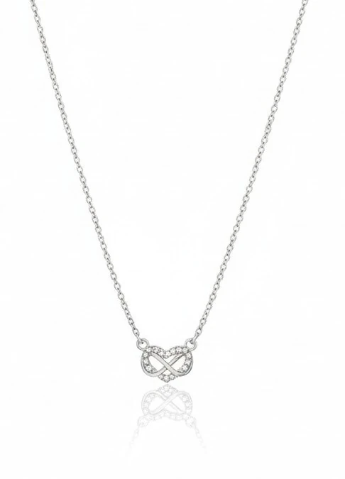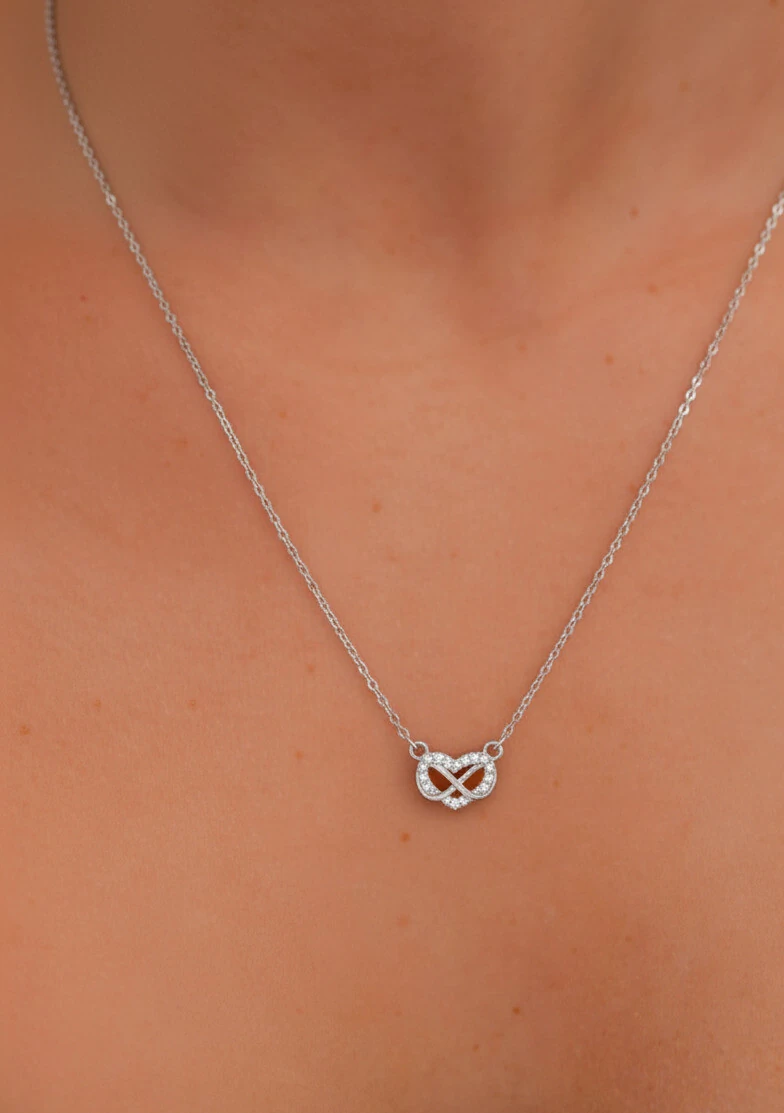 Colar delicado com pingente de coração entrelaçado ao símbolo do infinito, totalmente cravado em zircônias. Representa amor eterno e conexões que transcendem o tempo.