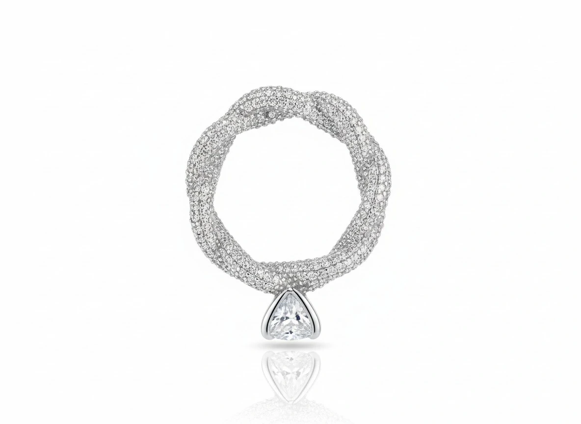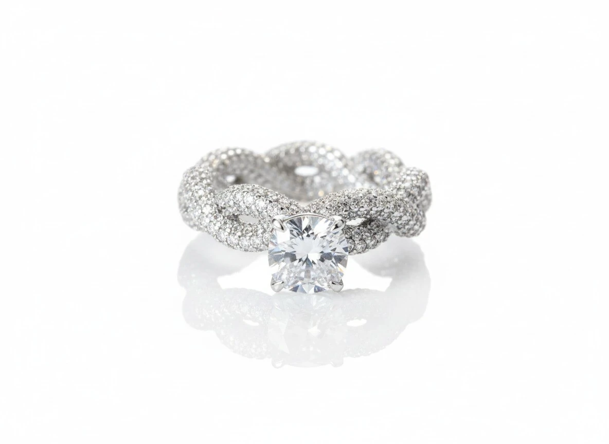 Anel solitário com aro torcido e micro cravação de zircônias em todo o corpo da peça, realçando a pedra central redonda de destaque. O entrelaçado simboliza união e eternidade, resultando em uma joia sofisticada e marcante.
